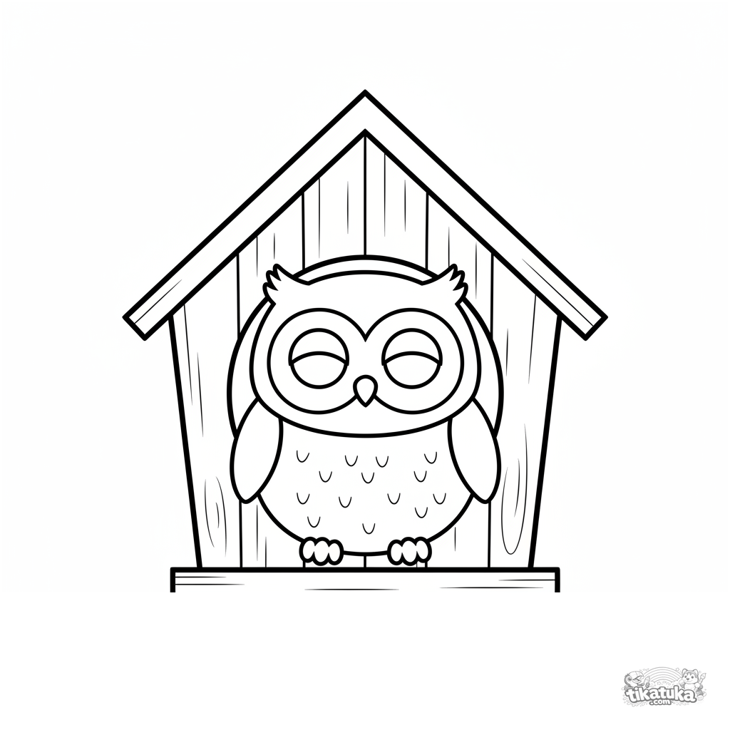 Very simple coloring page for toddlers 2-3: a round baby owl sitting in a birdhouse. Large shapes, thick outlines, lots of white space for coloring.