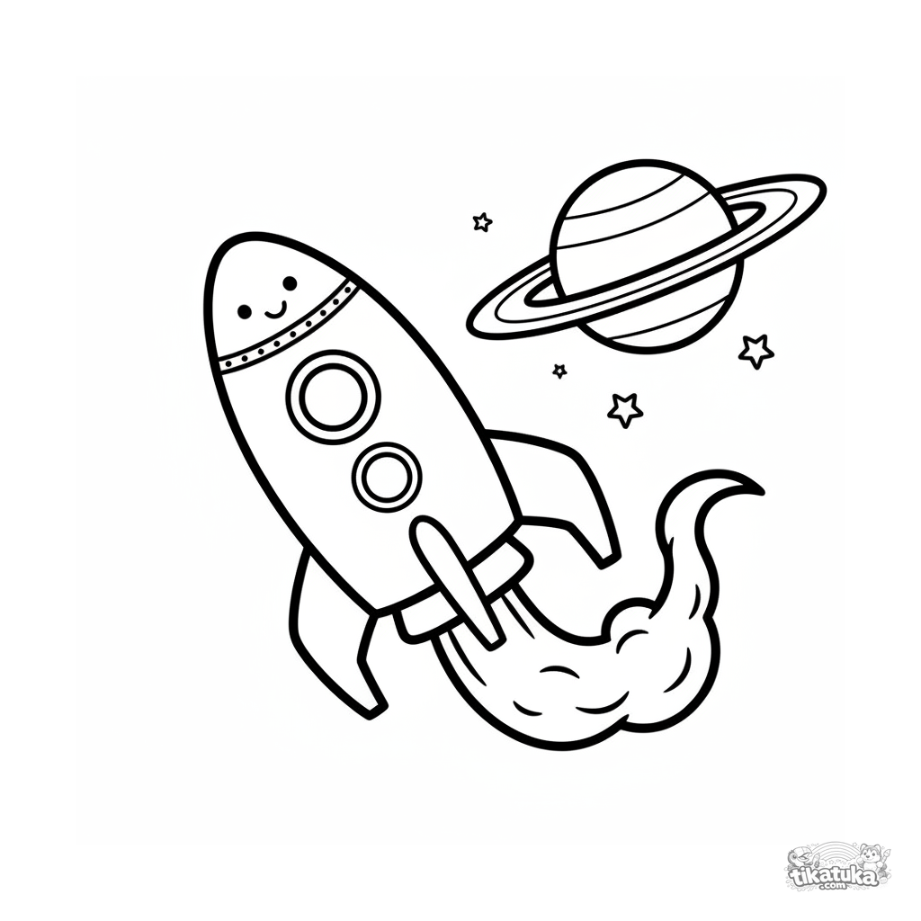 Very simple coloring page for toddlers 2-3: a smiling rocket ship flies among star outlines near a ringed planet. Large, easy-to-color shapes with wide white margins.