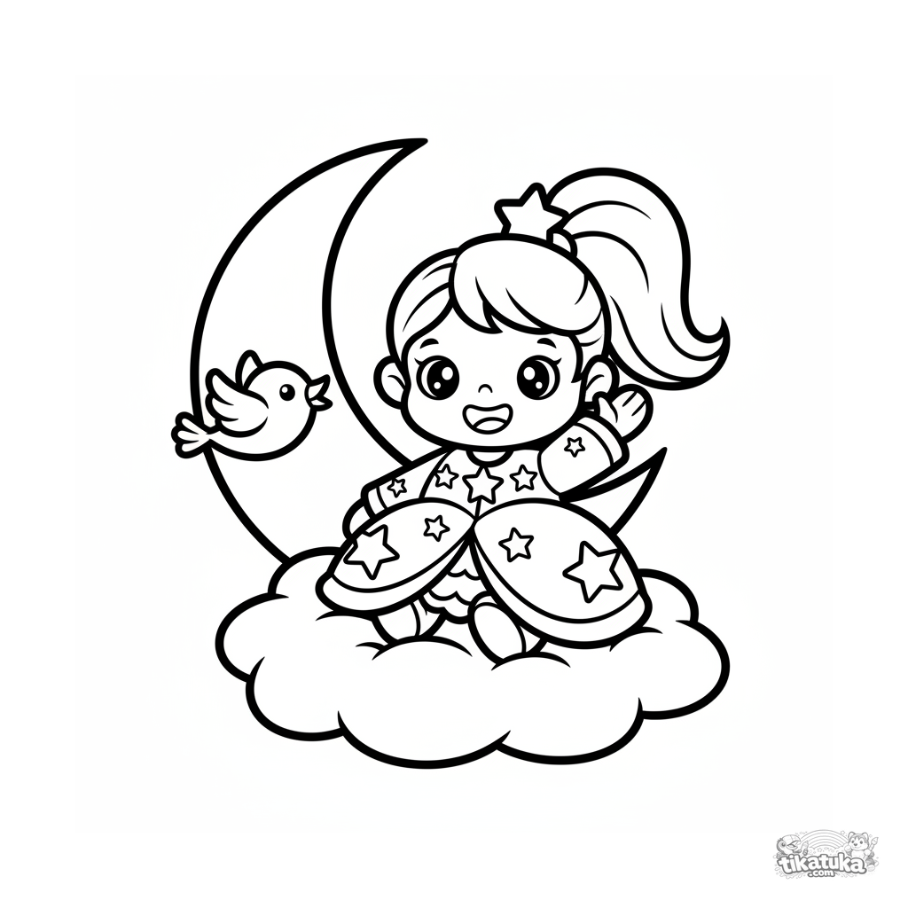 Very simple coloring page for toddlers 2-3: a sky princess sits on a fluffy cloud and waves at a bird. Large, clear shapes.