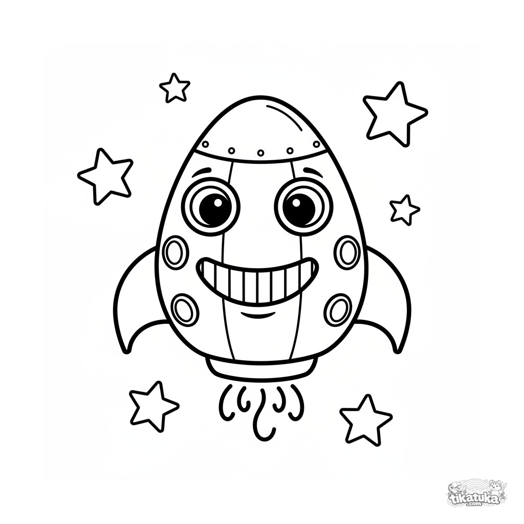 Ultra-simple coloring page for toddlers 2-3: a smiling spaceship floating among stars. Huge, thick outlines, one large shape, no tiny details whatsoever.