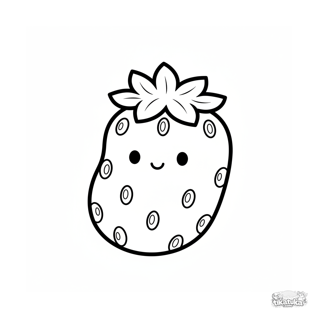 Very simple coloring page with a big strawberry for toddlers 2-3. Large shapes, thick outlines, no background for easy coloring.