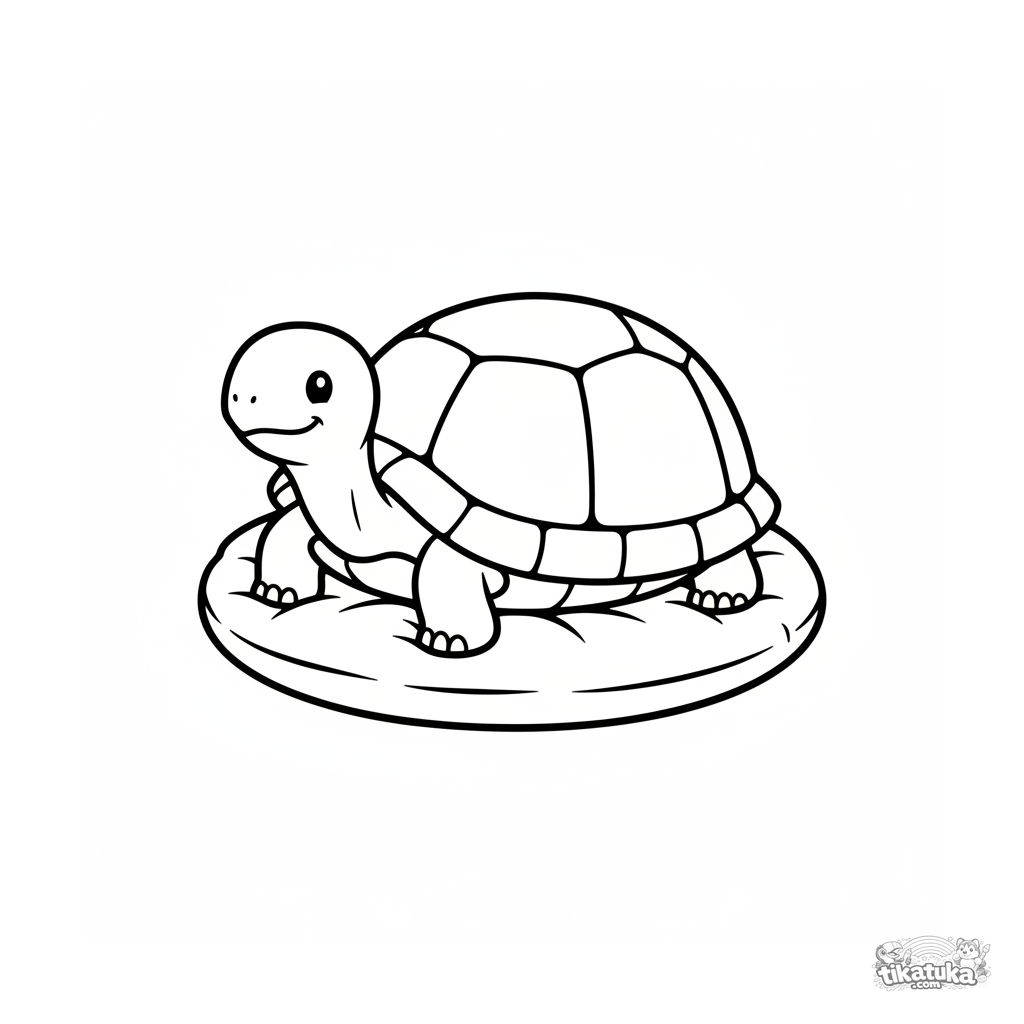 Clear and understandable coloring page for toddlers 2-3: a turtle with a large shell sits on a cushion. Simple shapes, thick outline, minimal detail for easy coloring.