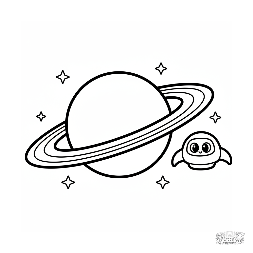 Simple coloring page for toddlers 2-3: a large ringed planet and a tiny spaceship among stars. Large, clear shapes, plenty of white space.