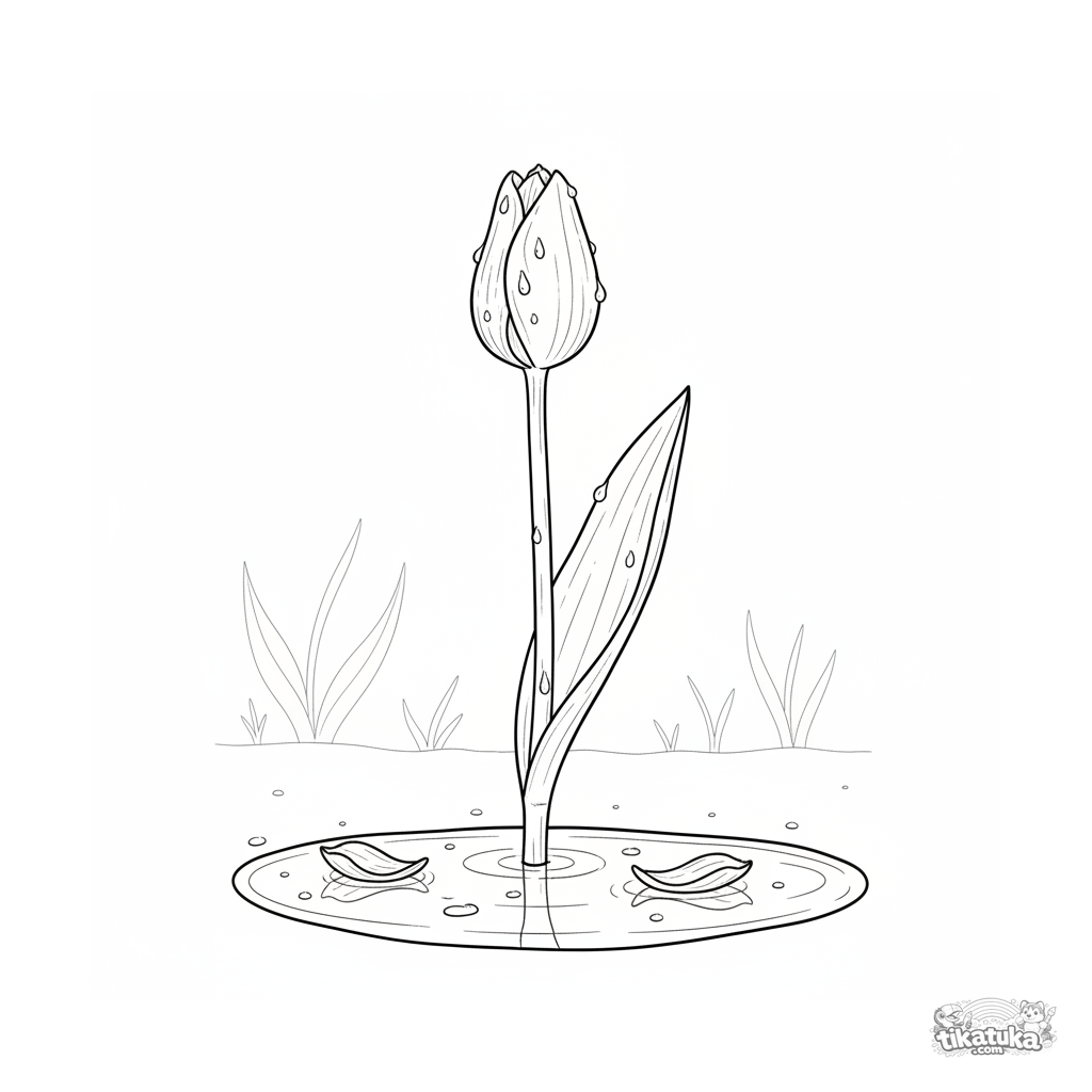 Coloring page for kids 4-6: a closed tulip bud standing in a rain puddle. A simple spring scene with reflection for coloring.