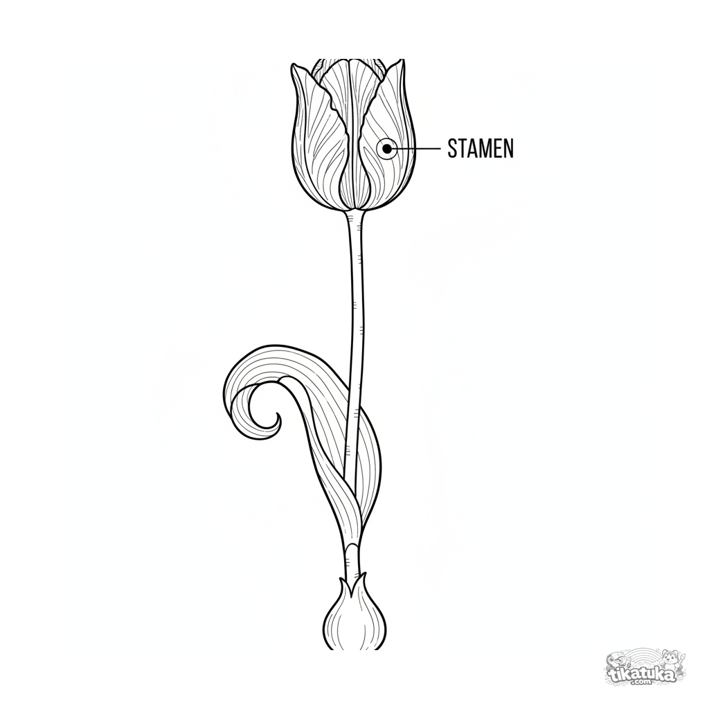 Botanical tulip coloring page for kids 7-9. Detailed petals, stem, leaf, and a small educational label. Clean white background.