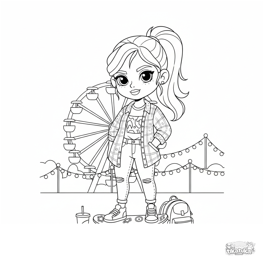Coloring page for kids 7-12: a skater girl posing with her sticker-covered board at a vibrant night fair. Detailed scene with Ferris wheel, string lights, and backpack.