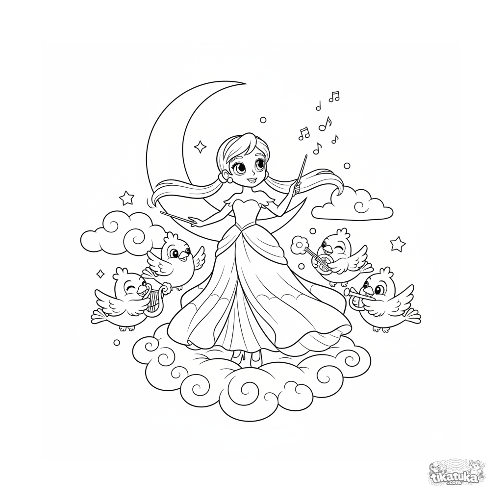 Coloring page for kids 7-9: a sky princess conducts an orchestra of cloud-birds on a wispy platform. Floating musical notes and a crescent moon in the background.