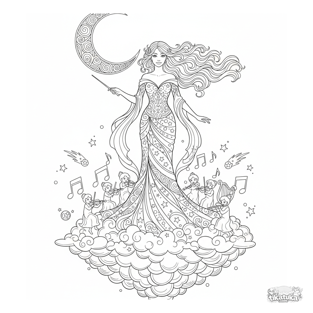 Detailed coloring page for girls 10-12 years: a sky princess conducts an orchestra of starlight notes on a floating cloud terrace. Intricate patterns and flowing lines.