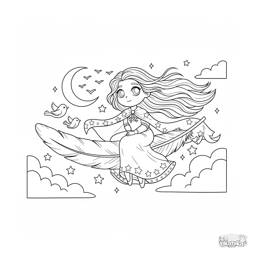 Coloring page for older kids 10-12: a sky princess rides a giant feather over starry clouds. Detailed outlines, magical scene to color.