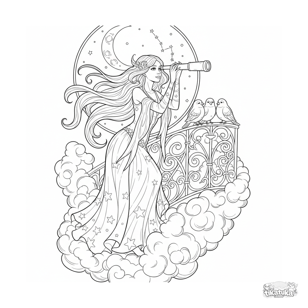 Detailed coloring page for kids 10-12: a sky princess in a starry gown gazes at constellations through a telescope from a fluffy cloud terrace.