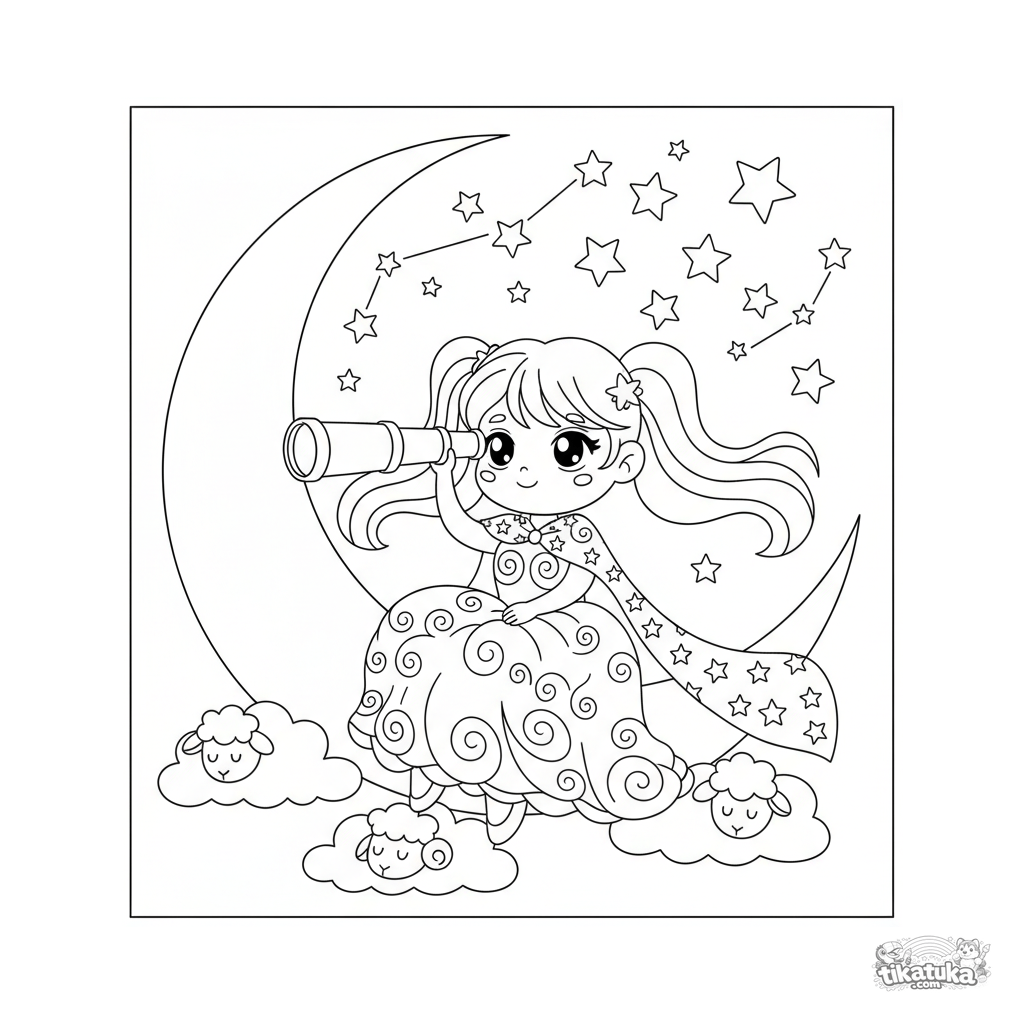 Coloring page for kids 7-9: a sky princess in a nebula dress sits on a crescent moon, watching stars through a telescope.