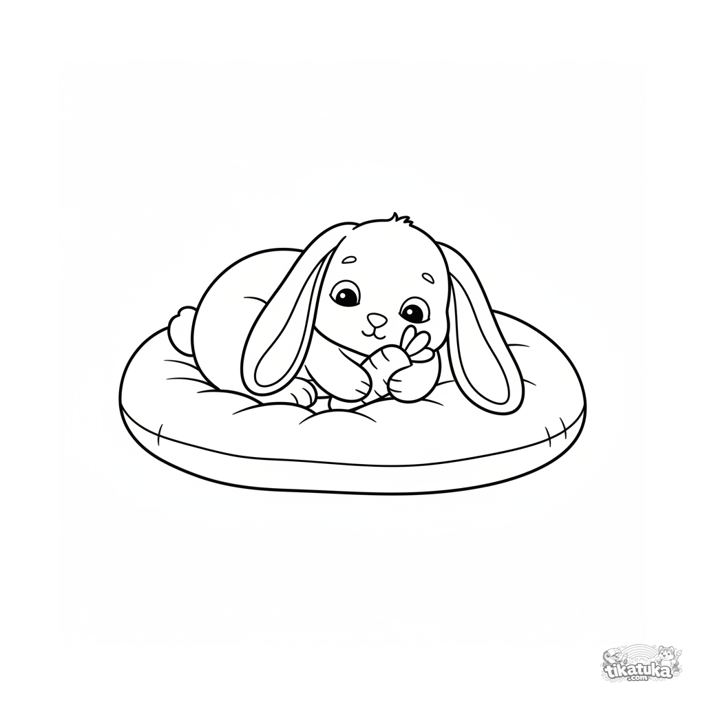 Coloring page for the very young: a sleeping plush bunny with a carrot lies on a cushion. Simple clean outlines, large shapes, wide margins for coloring.