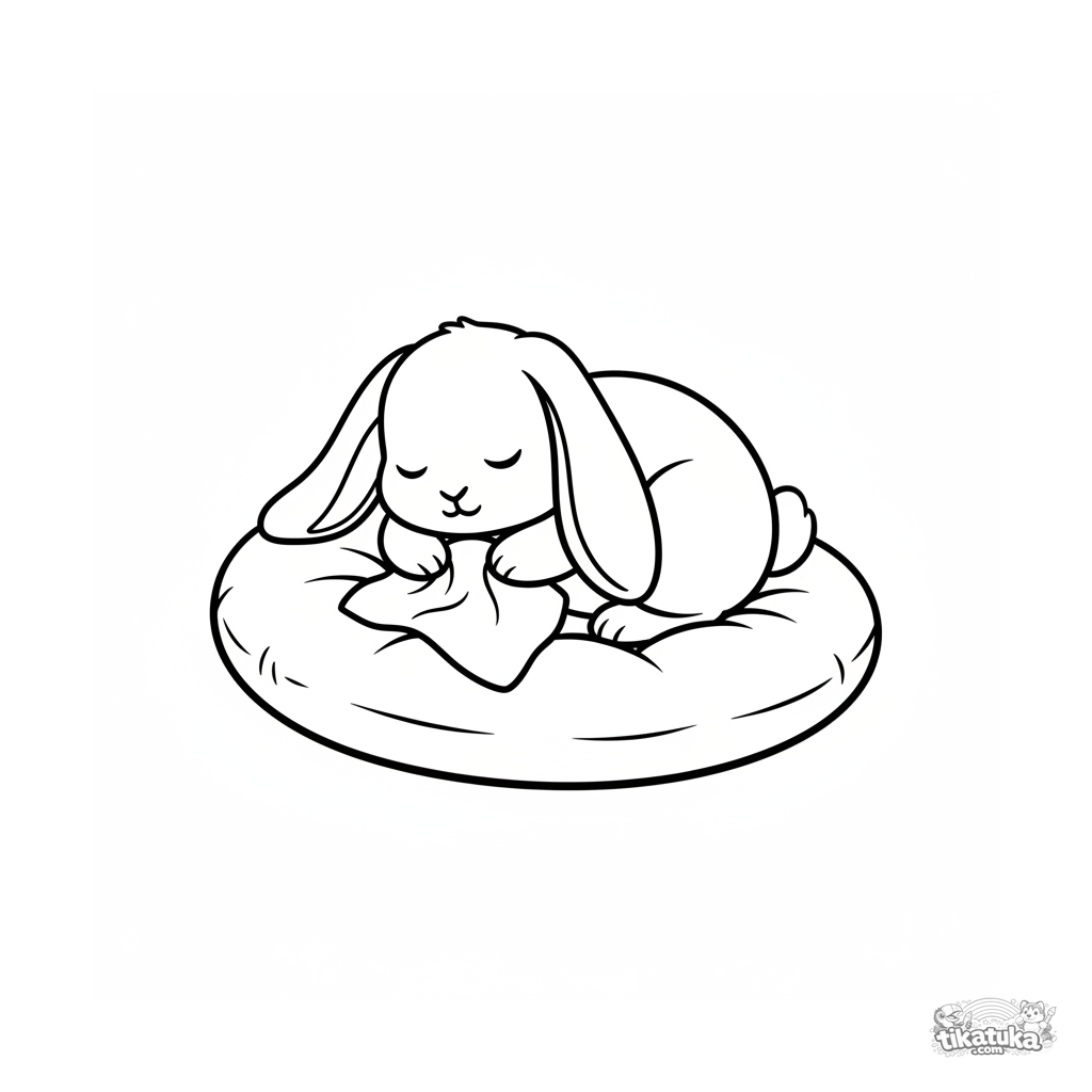 Coloring page for the very young: a sleeping plush bunny on a soft cushion. Large image, simple lines, no complex details — perfect for ages 2-3.