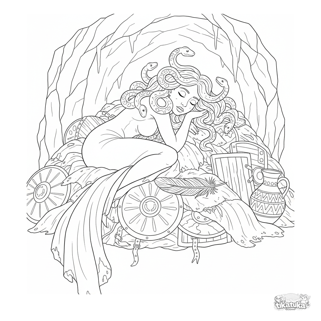 Coloring page: a sleeping Gorgon in her lair. For older kids 10-12. Detailed depiction of a mythical creature with serpent hair.