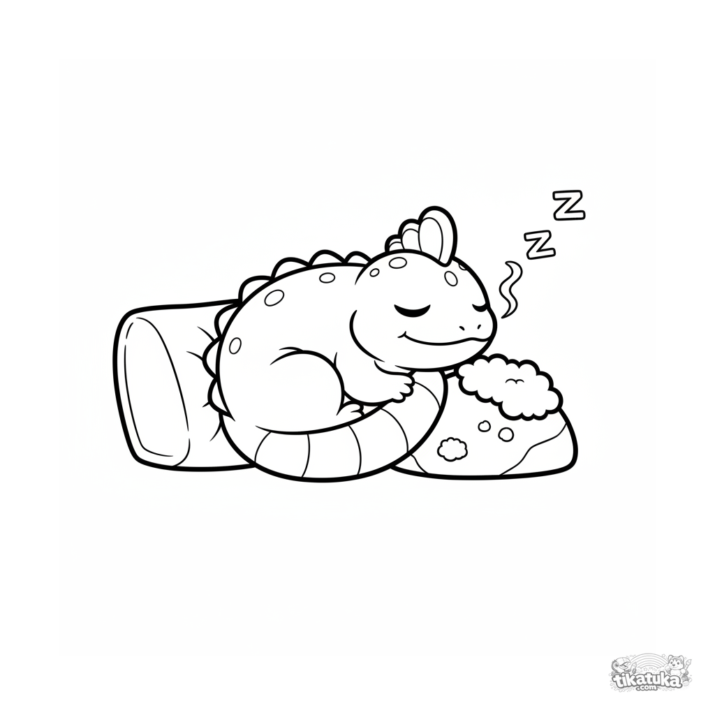 Simple coloring page for toddlers 2-3: a cute, sleepy basilisk napping against an ancient warm stone. Very simple, large shapes for coloring.