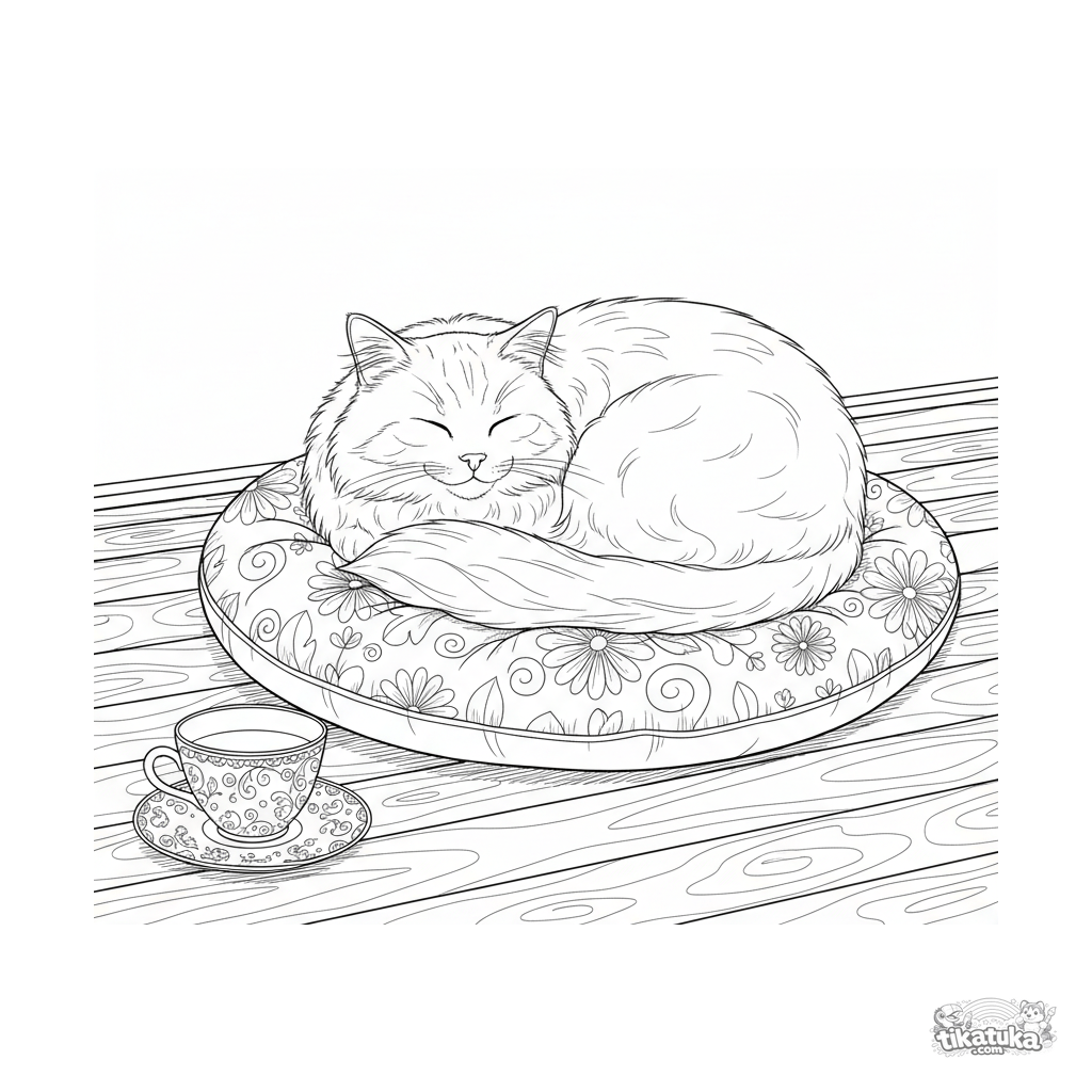 Detailed coloring page for older kids 10-12: a fluffy cat sleeps soundly on a cushion in a sunbeam on the veranda. A teacup is nearby. A scene of peace and tranquility.