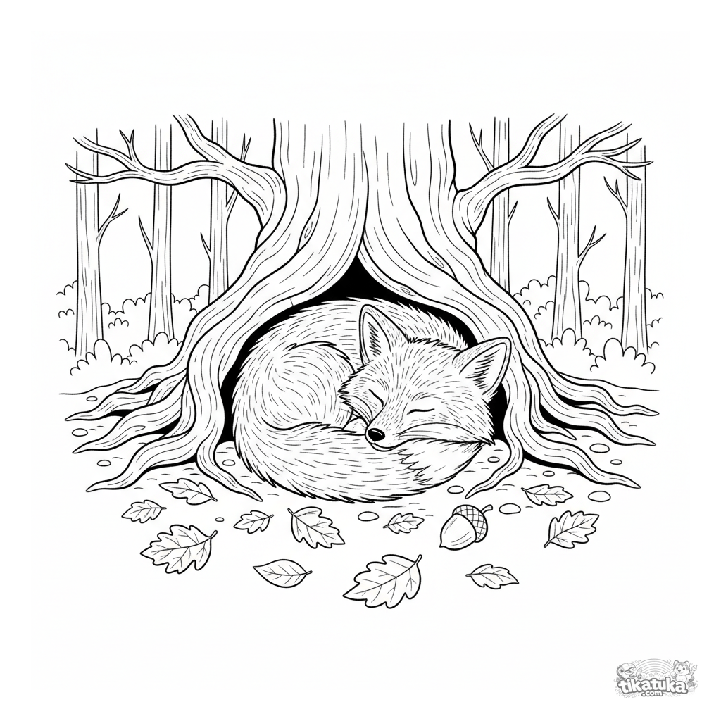 Coloring page for kids 4-6: a fox kit sleeps under an old oak tree in an autumn forest. Features fallen leaves and an acorn. Realistic style, peaceful scene.