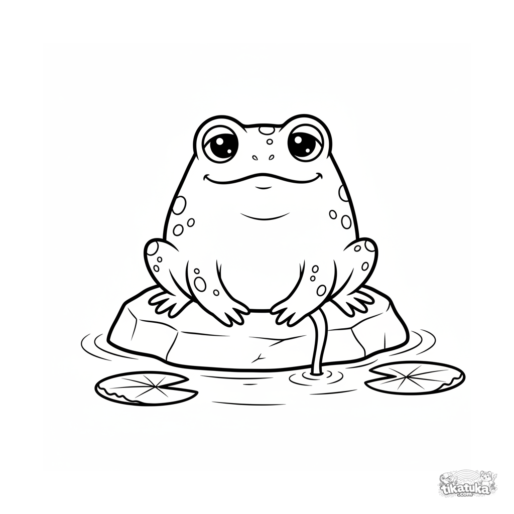 Simple coloring page for toddlers 2-3: a plump frog naps on a big rock in the middle of a clear stream, with one foot in the water.
