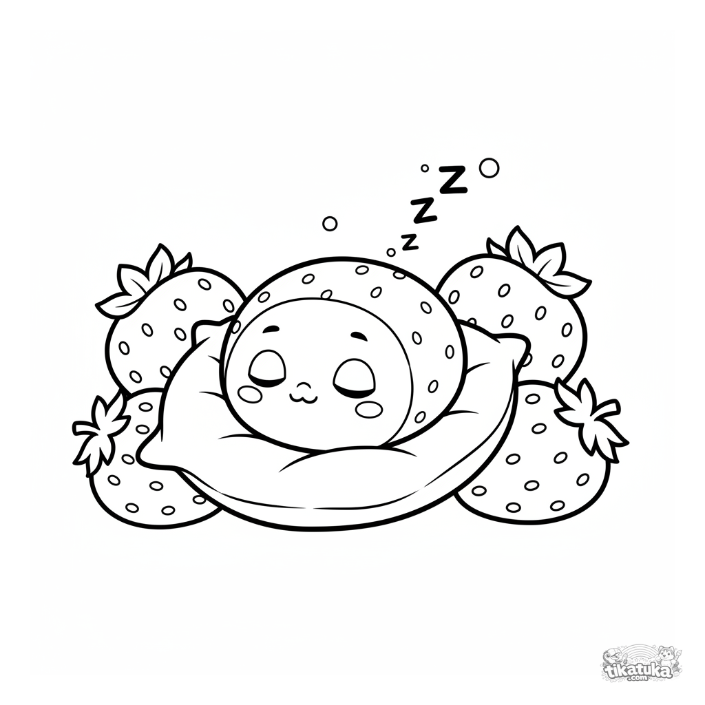 Simple coloring page for toddlers 2-3: a sleepy strawberry mochi napping on a leaf pillow. Large shapes, wide margins for first crayons.