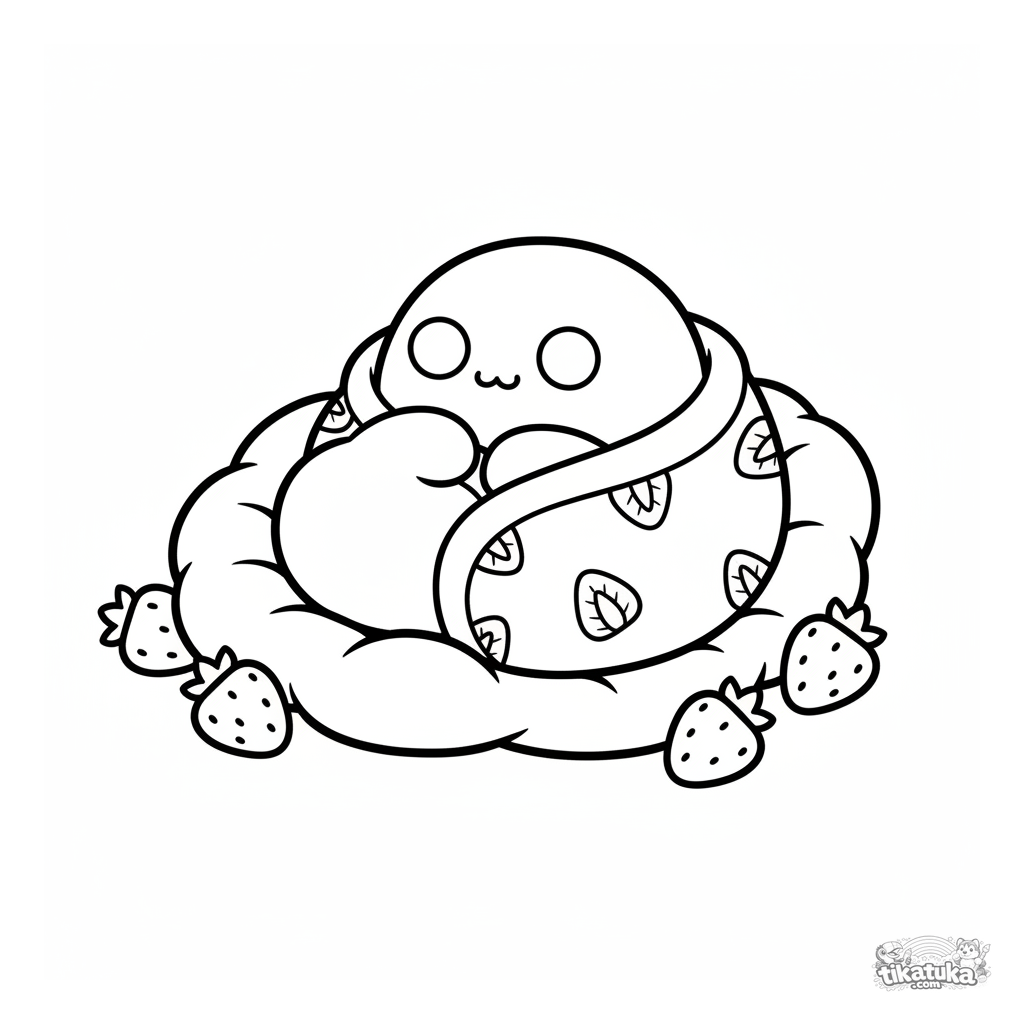 Toddler coloring page: a sleepy mochi cozily wrapped in a strawberry-slice patterned blanket on a fluffy pillow. Simple, calm scene with large shapes.