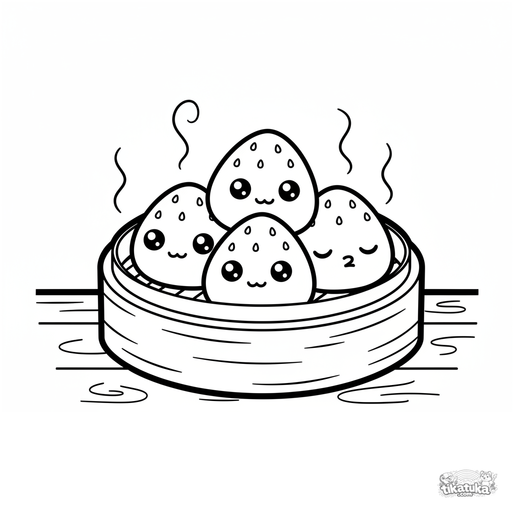 Toddler coloring page: a cozy pile of sleepy mochi in a bamboo steamer. Large, simple shapes and a calm scene are perfect for young children.