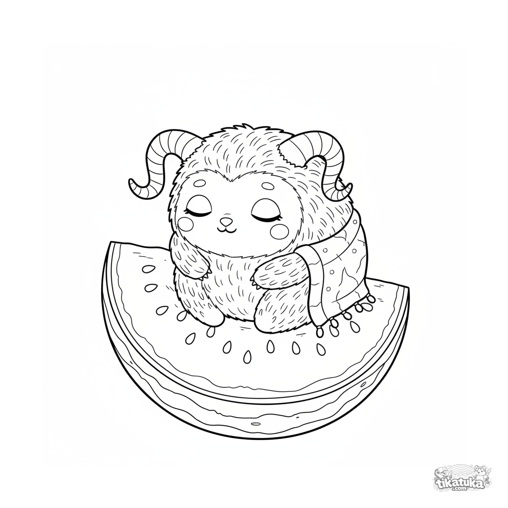 Detailed coloring page in field-guide style: a sleepy monster napping on a watermelon at a picnic. For kids 10-12 years old.