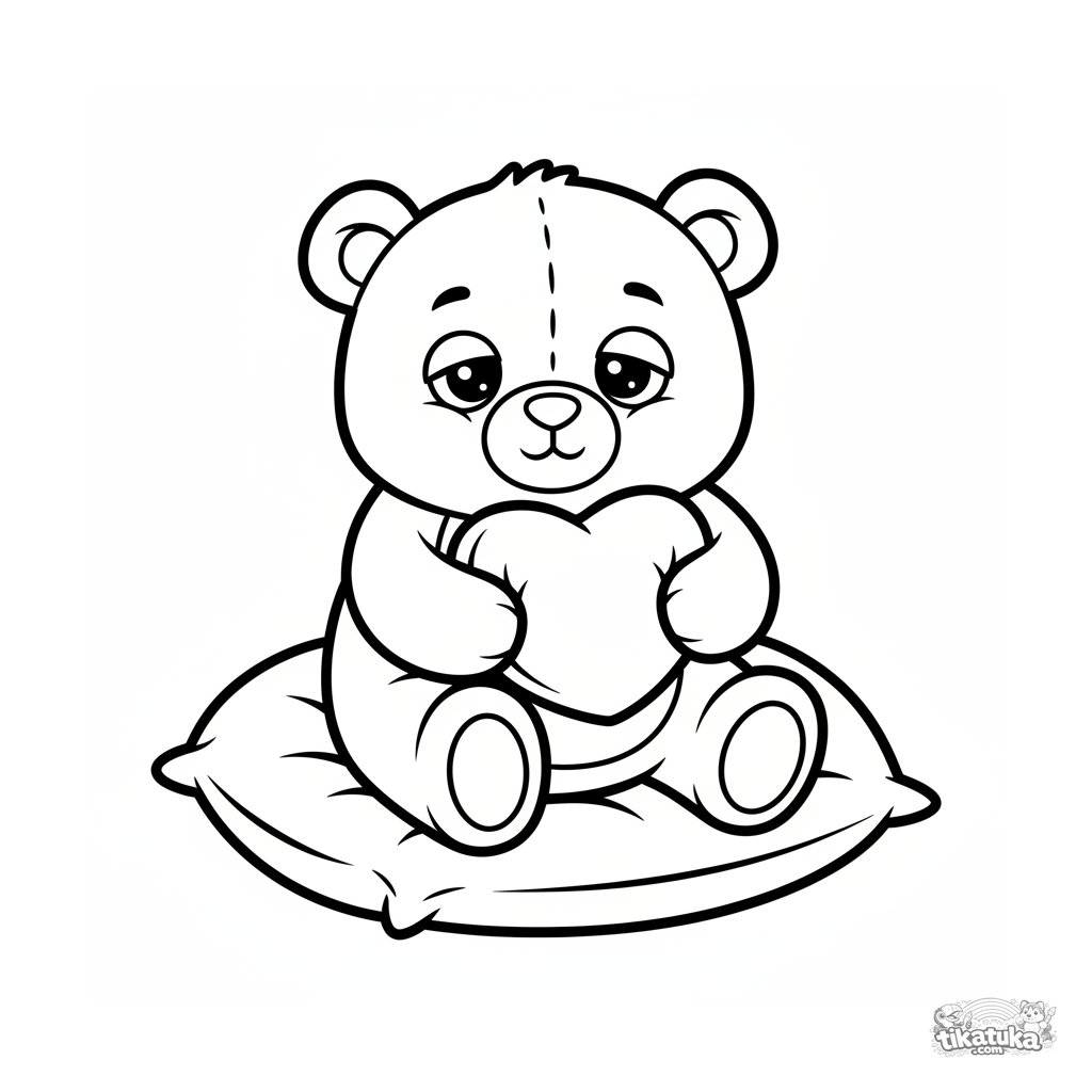 Toddler coloring page for ages 2-3: a sleepy plush bear sits on a soft cushion. Simple large shapes with wide margins for easy coloring.