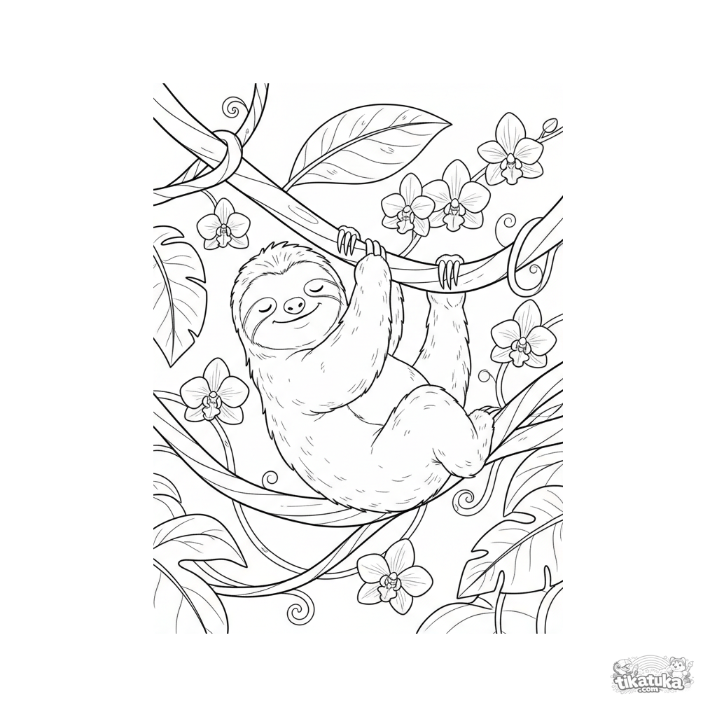 Kids coloring page: a sleepy sloth hangs from a curly vine in a misty rainforest, with orchids and large leaves. Medium detail and difficulty for ages 4-6.