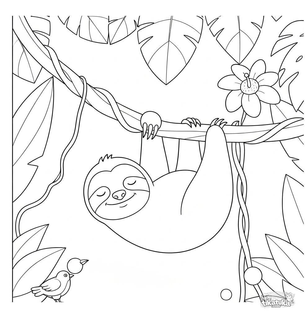 Coloring page of a sleepy sloth hanging from a vine in the rainforest. For toddlers 3-6 years old. Simple outlines of the sloth, vine, flower, and leaves.
