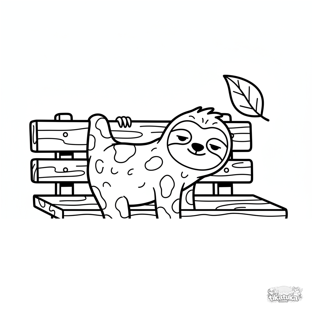 Coloring page for toddlers 2-3: a sleepy sloth hangs upside down from the arm of a park bench. Very simple, large shapes, perfect for first coloring.