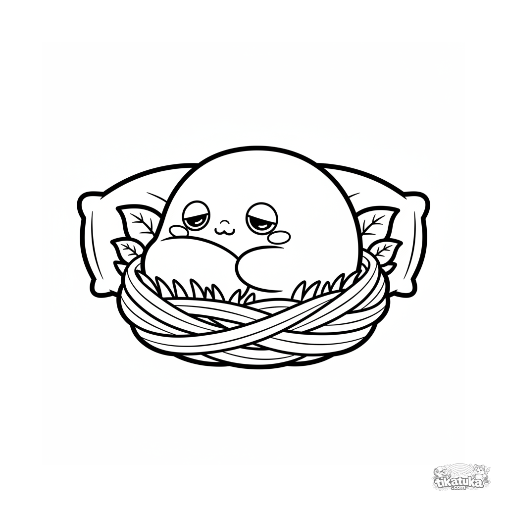Simple coloring page for toddlers: a sleepy strawberry mochi in a cozy nest. Large shapes, few details, perfect for ages 2-3.