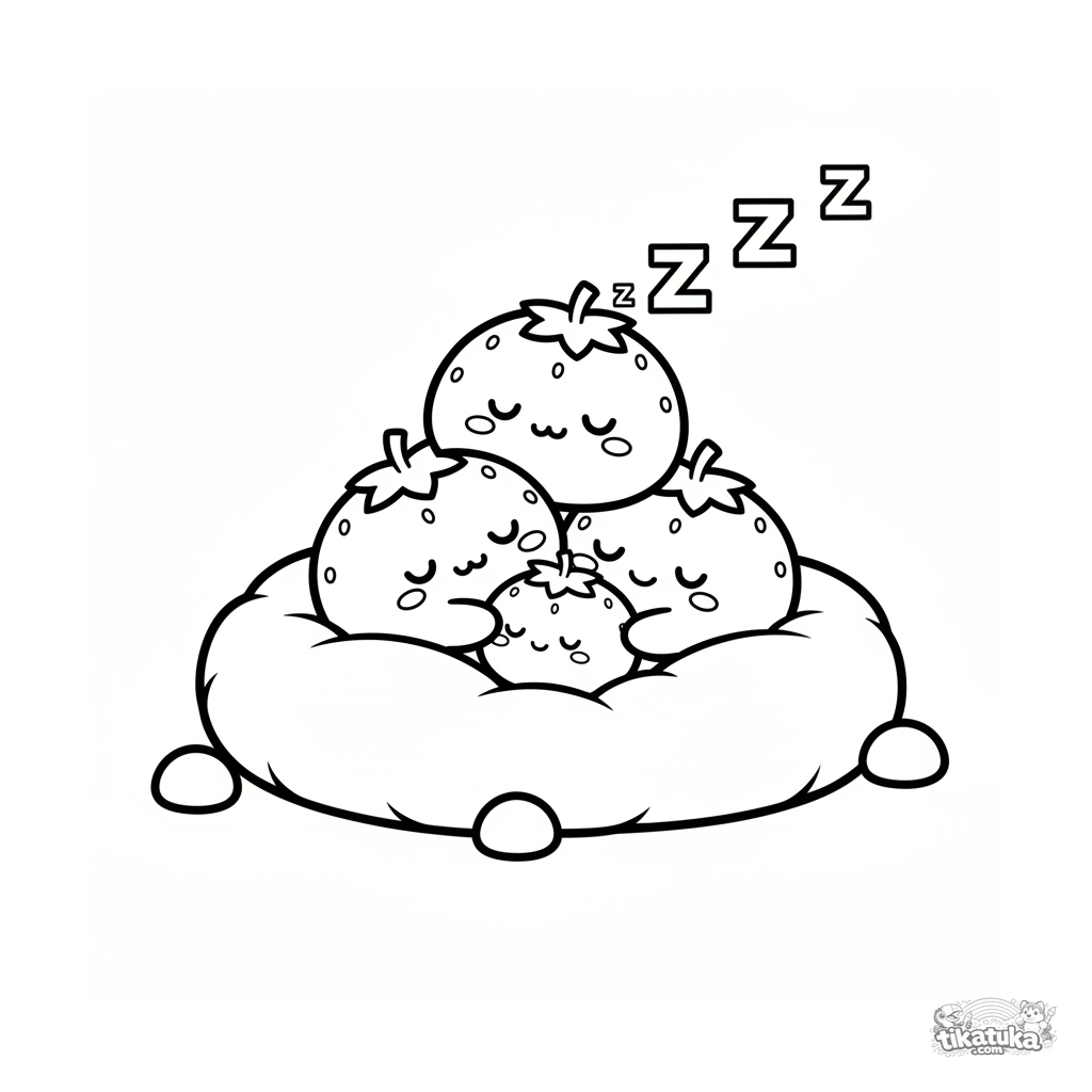 Simple coloring page for toddlers 2-3: a sleepy pile of soft strawberry mochi napping on a cushion. Large shapes, few details.