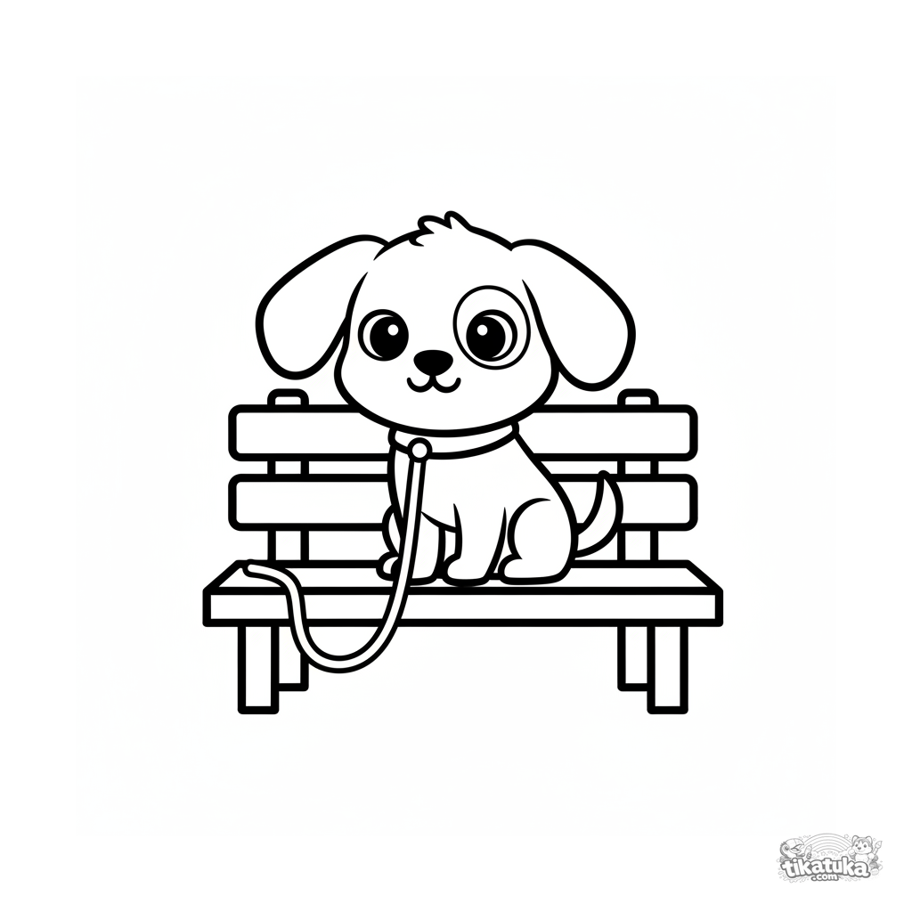 Simple coloring page for toddlers 2-3: a small dog on a leash waits for its owner on a park bench. Minimalist design, large clear shapes.
