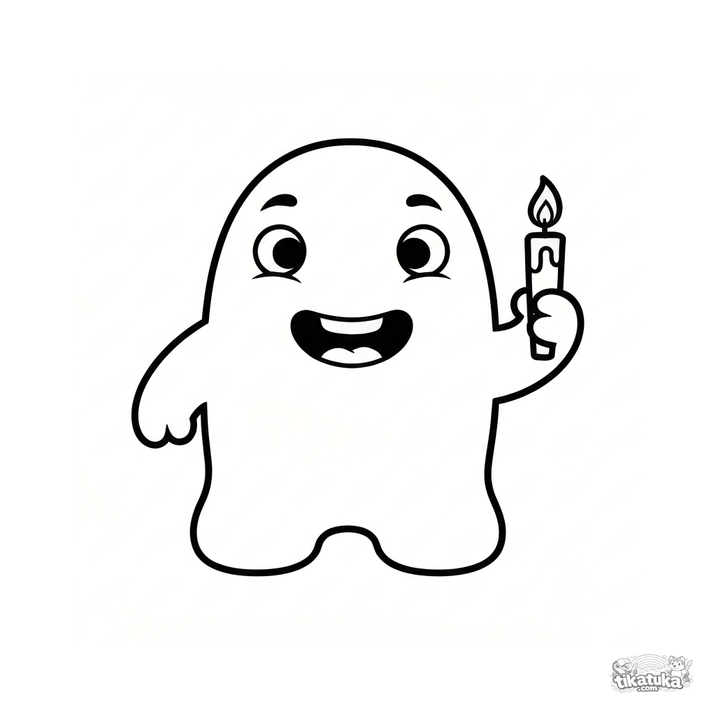 Coloring page for children 2-4 years. A cute blob monster with a big smile holding a birthday candle. Simple shapes for toddlers. Free download.