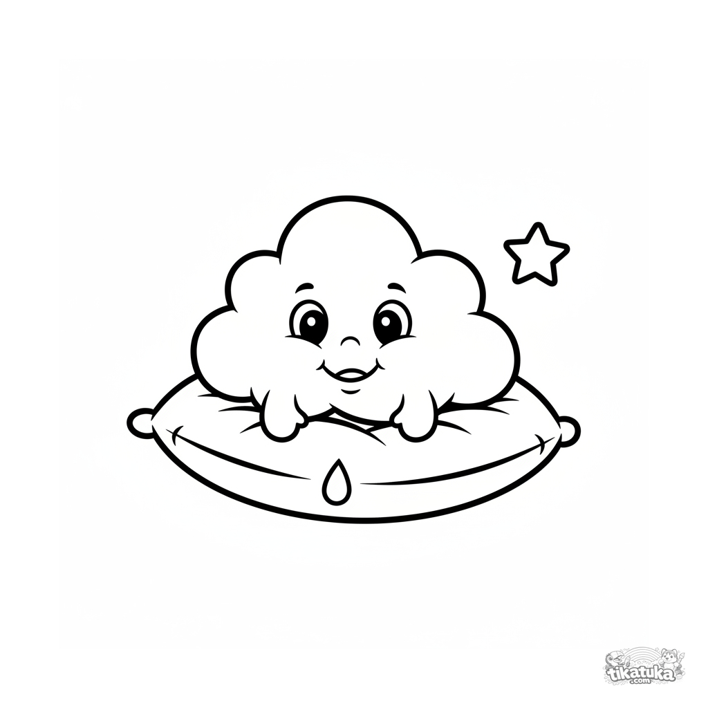 Toddler coloring page: a smiling fluffy cloud resting on a soft cushion. Very simple shapes, large coloring areas, and wide margins.