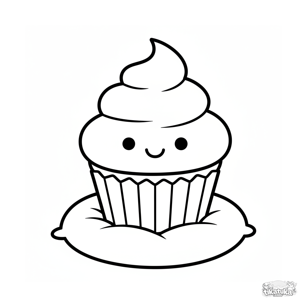 Cute toddler coloring page: a smiling cupcake with a face sits on a fluffy cushion. Very simple and large shapes, suitable for ages 2-3.