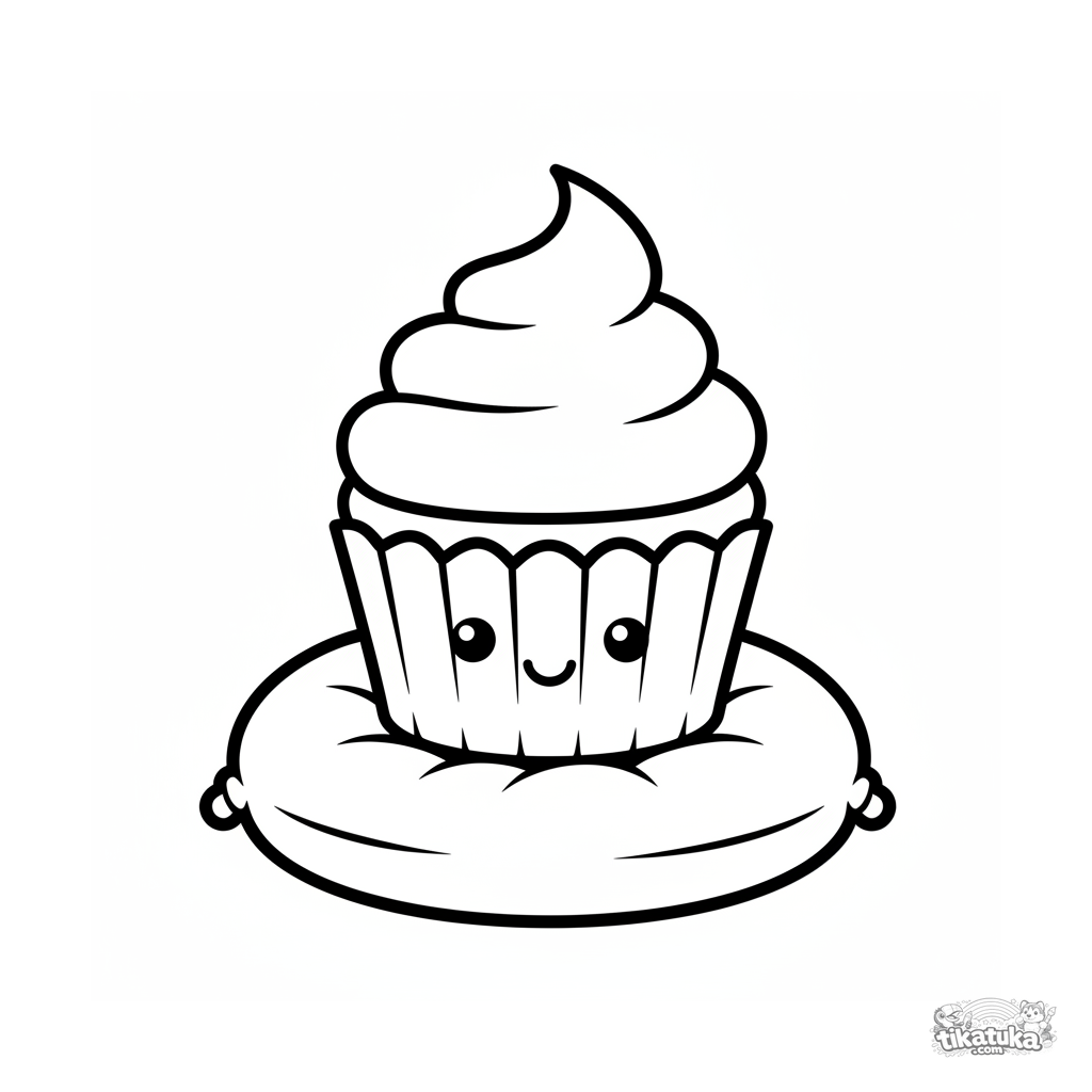 Cute coloring page for toddlers: a smiling cupcake sits on a pillow. Kawaii style, huge simple shapes, almost no details, perfect for children 2-3 years old.