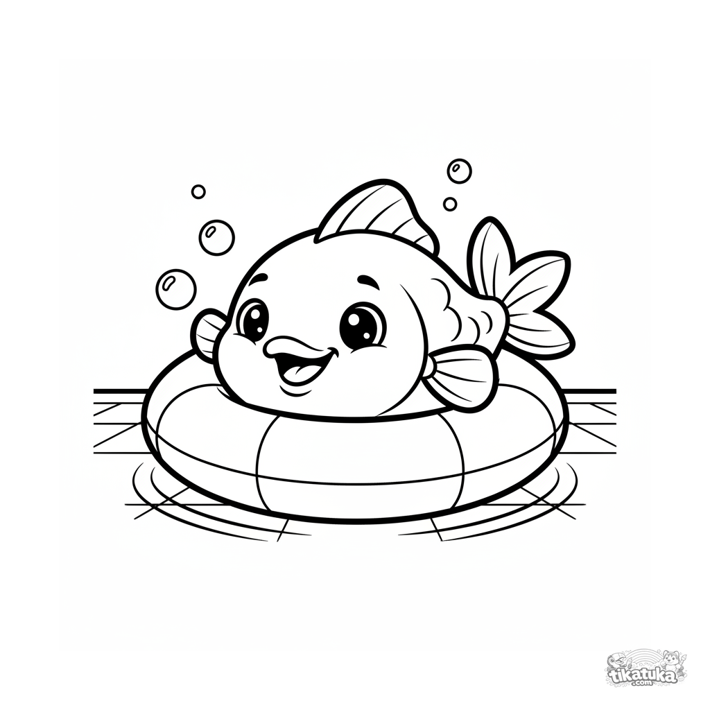 Coloring page for kids 4-6: a smiling fish plays hide-and-seek, peeking out from an inflatable ring on the pool bottom. Cheerful scene, clear outlines.