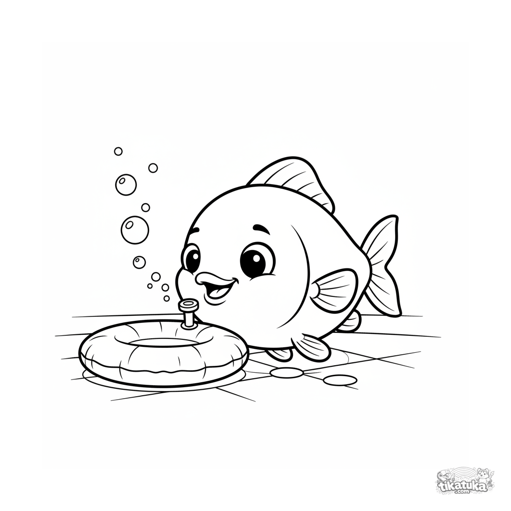 Coloring page for kids 4-6 years: a smiling fish curiously inspects the valve of an inflatable ring on the pool floor. Clear composition, friendly story.
