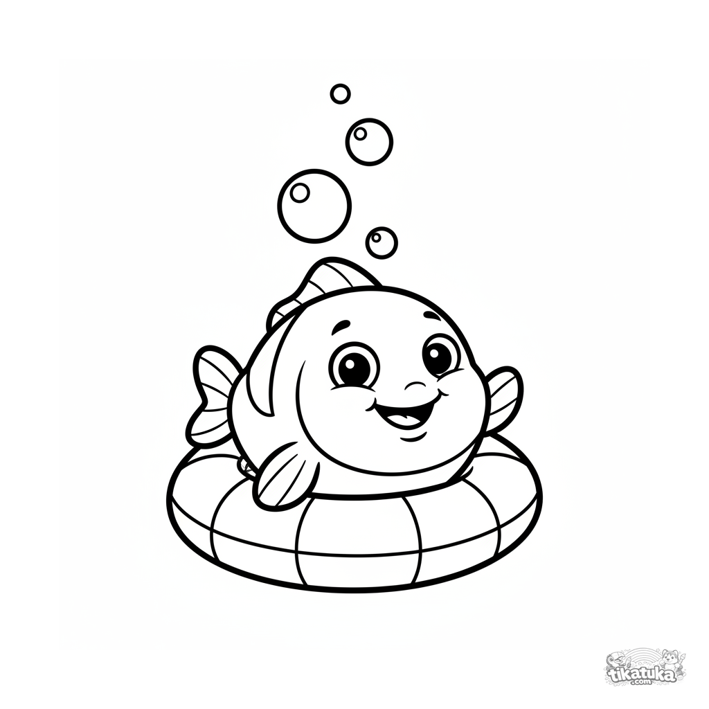 Very simple coloring page for toddlers 2-3: a smiling fish peeks out from an inflatable ring in a pool. Huge, friendly features, simple shapes.