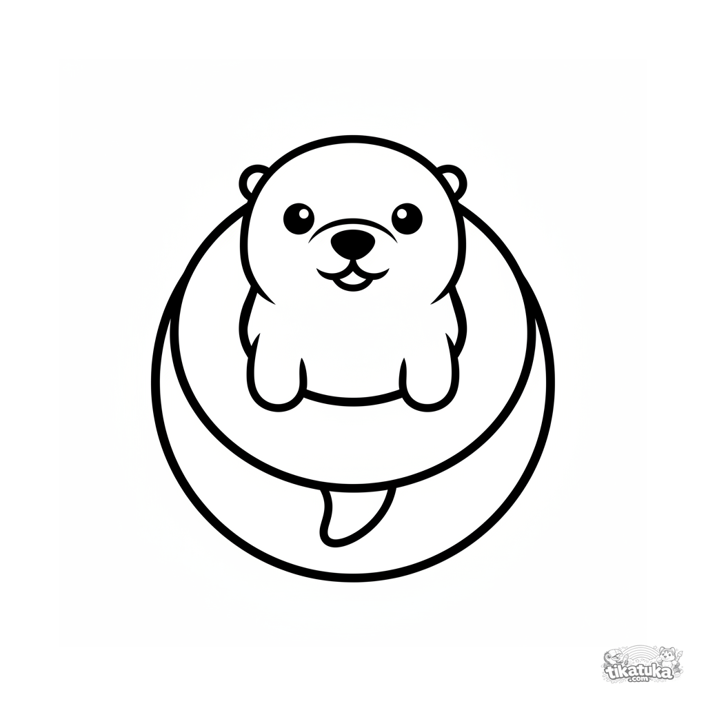 Simple coloring page for toddlers 2-3: a smiling otter pup lies in an inflatable ring in a pool. Huge areas for coloring, very simple outlines.