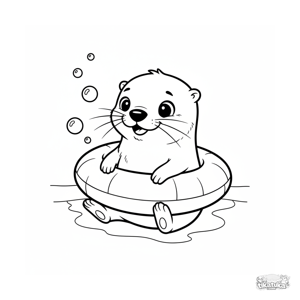 Coloring page for kids 4-6: a joyful otter pup rolls an inflatable ring along the pool bottom. Expressive face, simple background, friendly storybook style.