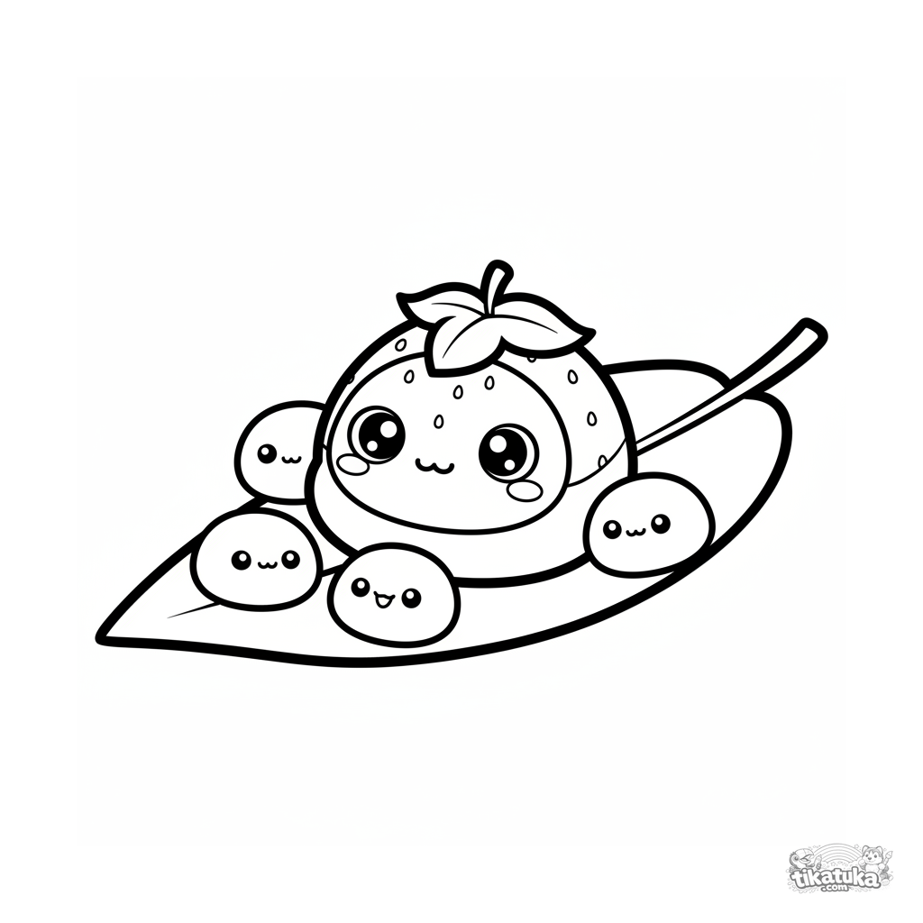 Toddler coloring page: a smiling strawberry mochi on a bamboo leaf among other mochi. Simple shapes and wide margins are perfect for first crayons.