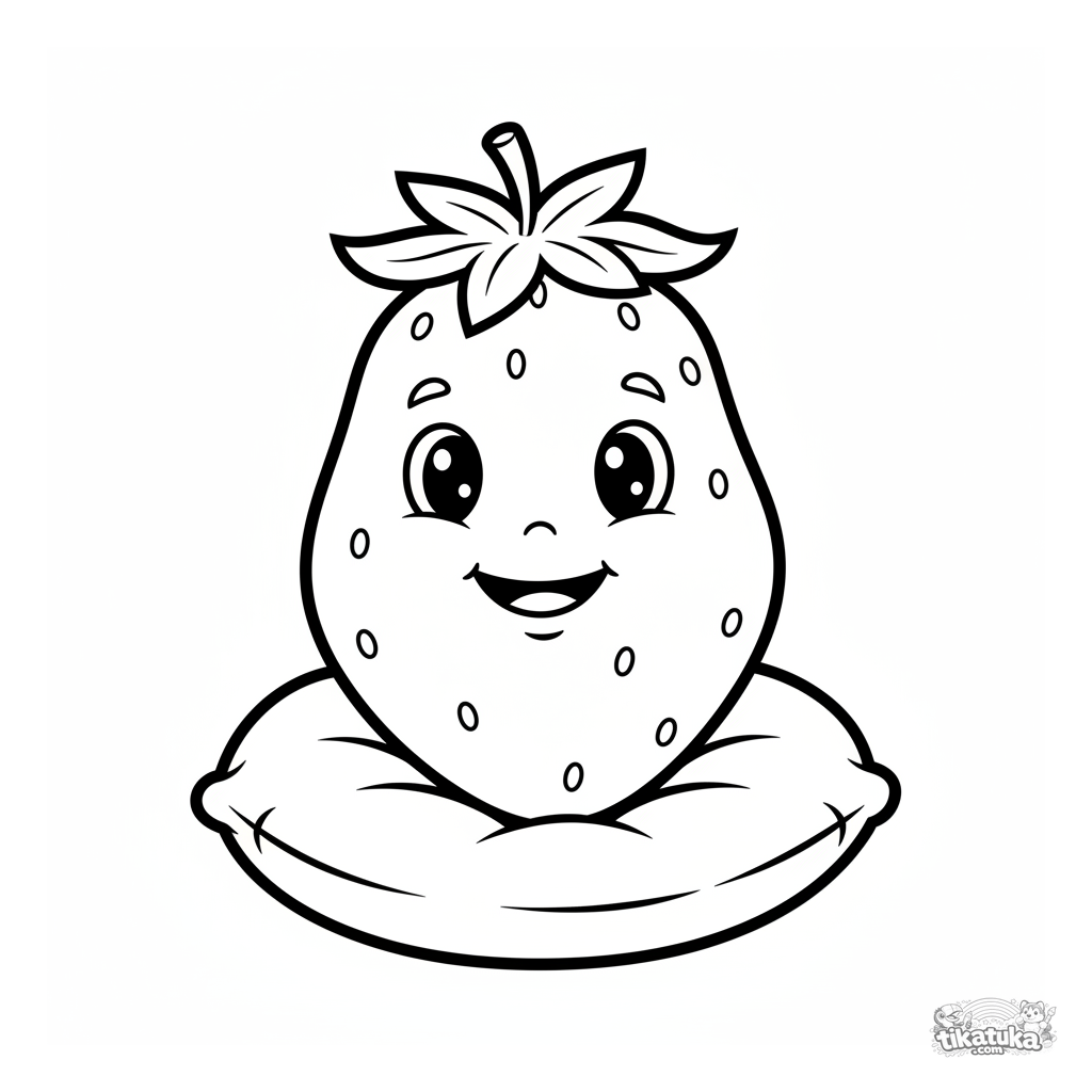 Toddler coloring page: a large smiling strawberry with leaves on a soft cushion. Clear outline, friendly face, a few seed dots, perfect for ages 2-3.