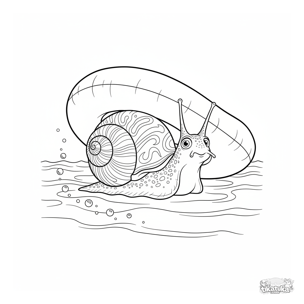 Detailed coloring page for kids 10-12: a snail with a spiral shell cautiously peeks out from under the rim of an inflatable ring on the pool floor. Naturalistic lines, textures.