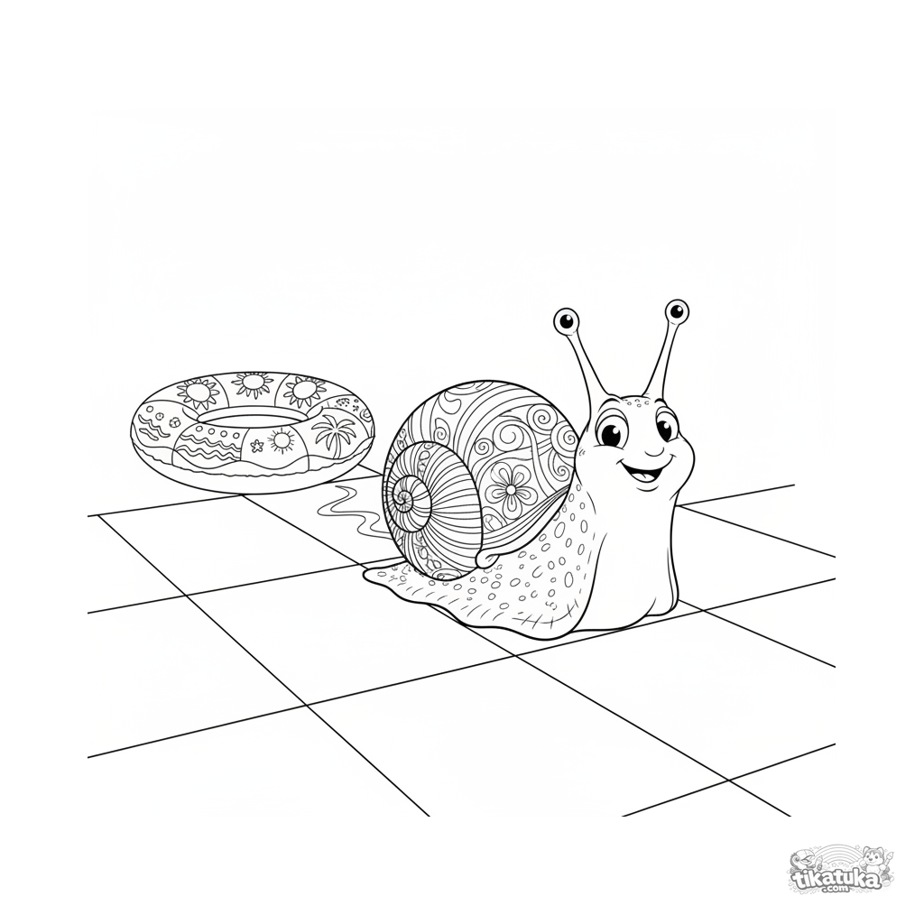 Detailed coloring page for ages 10-12: a cute snail with a spiral shell crawls across the pool floor tiles towards an inflatable ring. Naturalistic style, anatomical details.