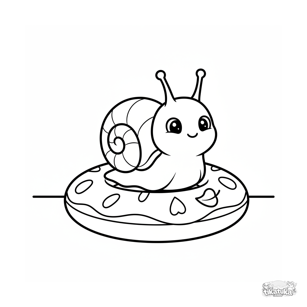 Very simple coloring page for toddlers 2-3: a smiling snail sits on an inflatable ring at the pool bottom. Large, clear shapes and plenty of white space.