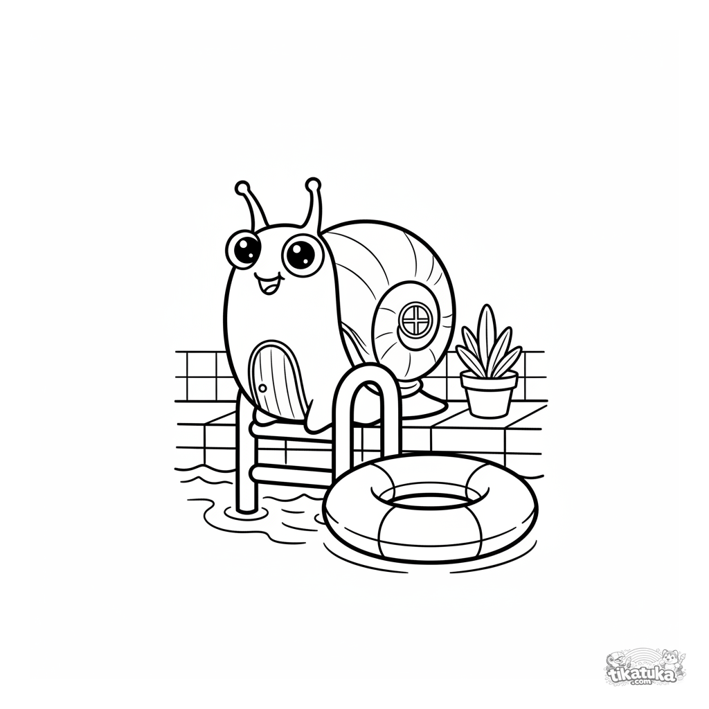 Coloring page of a cute snail whose shell looks like a little house, climbing a pool ladder. For kids 4-6 years old. Simple and clear storyline.