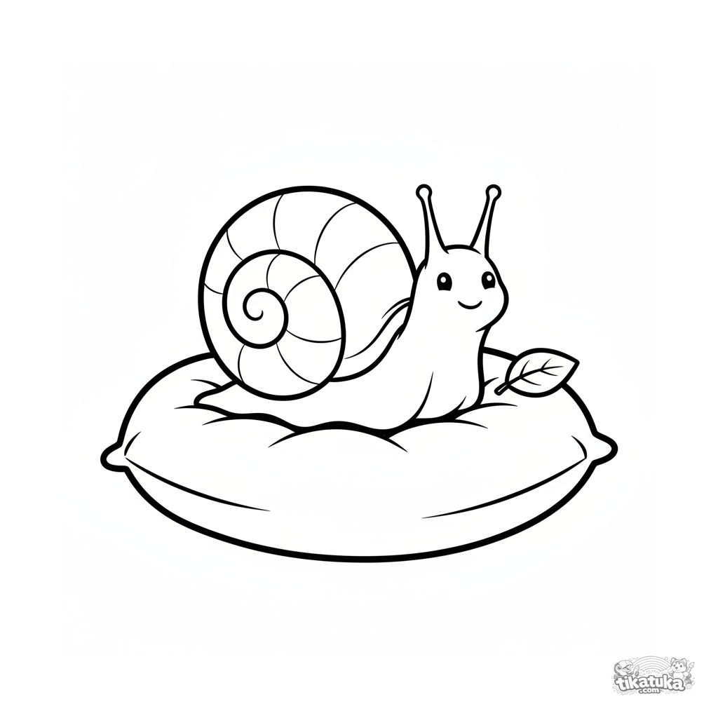 Toddler coloring page: a cute snail with a shell house rests on a cushion. Clear outline and large spiral are perfect for first coloring pages for kids 2-3.