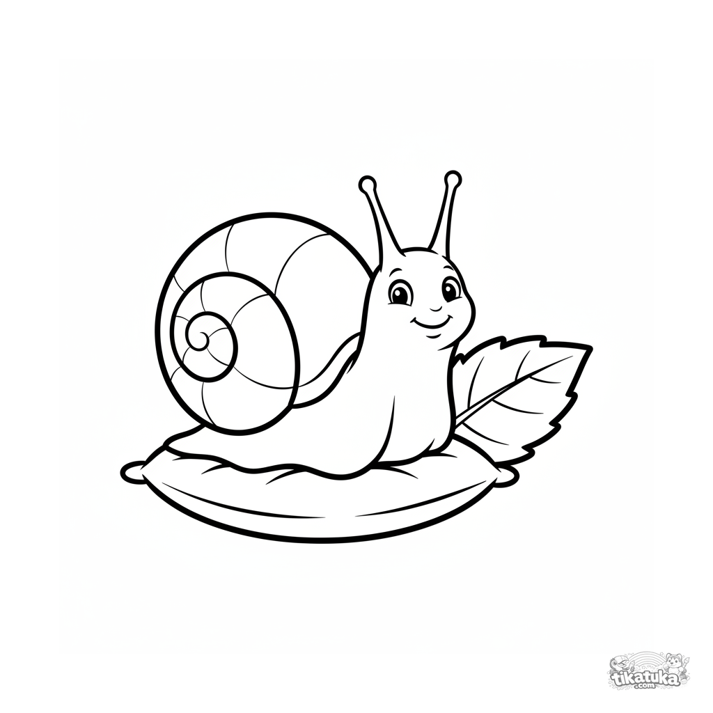 Coloring page for ages 2-3: a snail with a shell house rests on a soft cushion. Clear outlines, large shapes, few details.